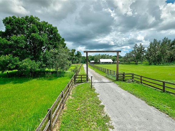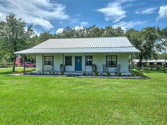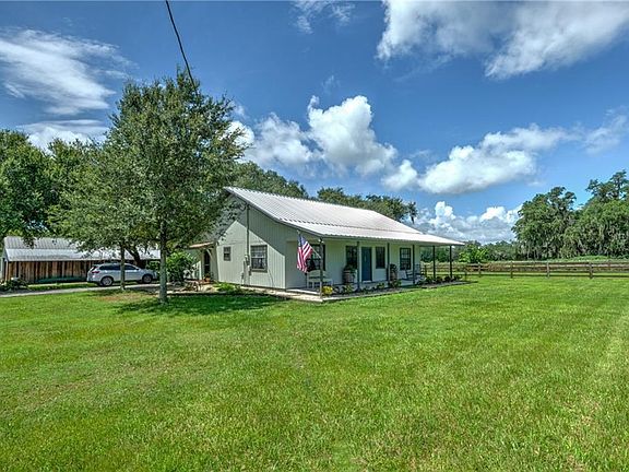Looking for PEACE and QUIET? This cozy 3/2 home is situated on 5 acres with a gated driveway and it is set back 1000 feet from SR64. Ideal if you are looking for a country life style free of HOA and CDDs. No Deed Restrictions. Features of this home include front and back porches, metal roof, open flor plan, wood floors, and newly painted interior and exterior. It has two functional outbuildings with electric and water. The larger one a 30x60 workshop/barn has a full bath with its own septic and an office. The barn has a feed room, 4 stalls and animals can be turned out to pastures. Fence boards and siding for outbuildings are repurposed rough sawn and treated lumber. There is a gun range with a high dirt backstop. The back of property is wooded as seen on photos. The country drive is only 15 miles from I75, new Costco, and shops. Lots of potential for those seeking the out east country lifestyle.