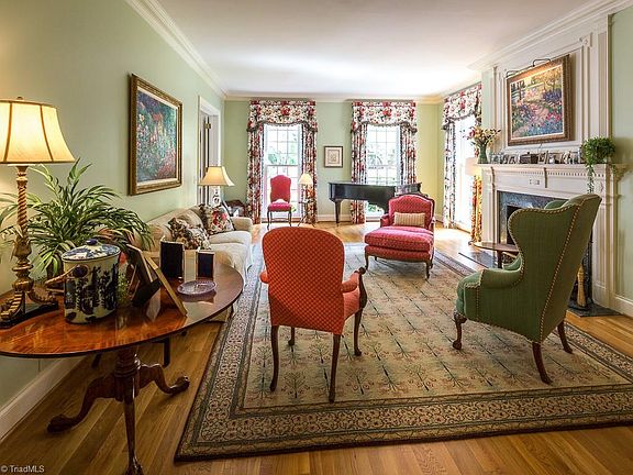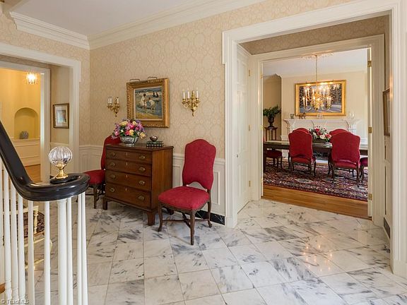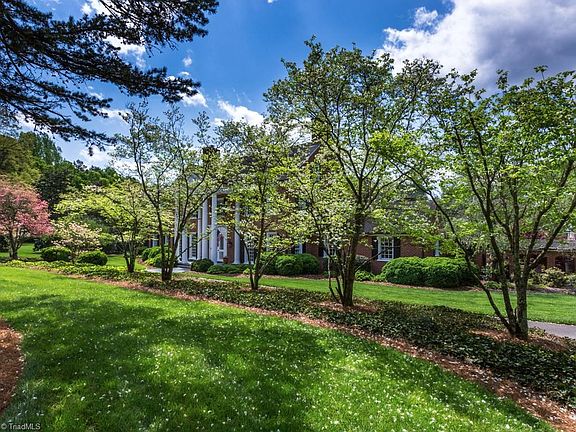 Stately Georgian style estate on 2.7+ acres in prime Reynolda Woods location.The private setting is bounded by Reynolda House grounds. Grand entrance hall with beautiful staircase and designed for large scale entertainment- 33x17 sunroom overlooks gorgeous swimming pool. Elegant formal rooms, handsome library, main level master suite.Renovated kitchen with large pantry, laundry facility and breakfast room.Detached multi-car garage with guest apartment.Ultimate game rm w/about 1,000sq not included in total