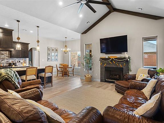 Beautiful move in ready home in Autumn Ridge! As you drive up pretty landscaping and green grass greets you! Once inside you will be wowed by vaulted ceilings with beams, gas log fireplace, open concept, stained cabinets, gas stove, granite countertops, & updated lighting. Primary suite features tray ceiling, double sinks, soaking tub, tile shower, walk in closet. This home can be utilitized as a 4 bed or 3 bedroom with an office! Laundry room and large walk in pantry. Green accent wall doubles as a mud bench area with hooks! Three car garage and outdoor entertaining area on back patio. Full sprinkler system. Don't miss out on this gem!
