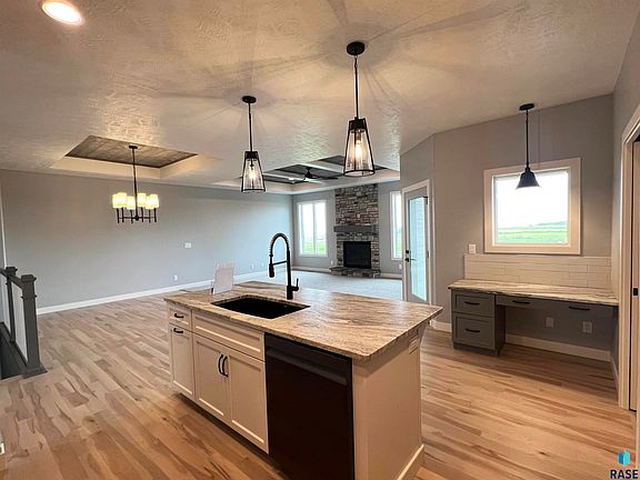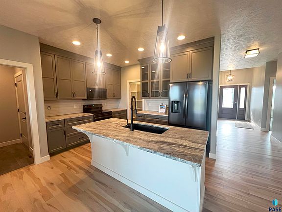 Stunning and expansive ranch walkout boasts a charming facade and tasteful architecture including a sprawling side-load garage located in eastern Sioux Falls. Featuring an open floor plan which seamlessly connects the living, dining, and kitchen areas, this home is well-equipped to accommodate large gatherings or the small, quiet evening. The living room includes a gas fireplace with floor-to-ceiling stone and flanked by two large windows. The dining and living room ceilings feature a touch of rustic elegance with shiplap within the step-up ceilings. The kitchen offers sophistication and modern refinement with a two-tone premium painted cabinet design. A large walk-in pantry provides ample storage and organization. Granite tops and tile backsplash help capstone the high-end finishes. The primary suite includes up to 10ft ceiling, nearly 8ft granite countertops with dual sinks, cabinet vanity, walk-in custom tile shower, and massive walk-in closet. Incl lawn and sprinklers.