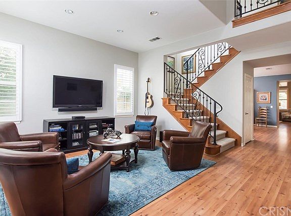 Gorgeous gated executive home in the much sought after Westridge area of Valencia. This beautiful home features the down stairs master suite, Wood type floors, upgraded carpet, plantation shutters throughout & Custom iron staircase. The kitchen opens to the family room with cozy fireplace and built in entertainment center. Upstairs is 3 bedrooms, 2 with their own bathrooms. The back patio has a built in barbeque with bar for seating, beautiful patio cover and free standing spa. The garage is Tesla ready with charging station!Located near the Oaks golf club, award winning schools, shopping, restaurants and easy access to the 5 freeway!LOW HOA and NO MELLO ROOS!