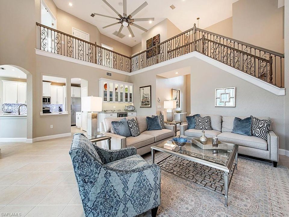 H.16053 - Beautifully remodeled with a focus on detail. Neutral colors, wonderful use of space and light and bright. All cabinetry updated, new bathrooms, laundry room and an expanded living room area which flows into a Florida room. Soaring ceilings with an upstairs which is perfect for your guests to have their own space. Utilize the upstairs area with 3 bedrooms or 2 bedrooms and a large TV/family room. With the addition of the Florida room enjoy 2,739 square feet overlooking the Bay Harbor pond. Stainless steel appliances, freshly painted, new carpets, quartz countertops, brushed nickel hardware, updated lights and fans throughout the home plus a new A/C in 2020. Bay Harbor has a lovely pool, spa and pool house with many community events. Bonita Bay offers an array of amenities including over 12 miles of walking and biking trails, parks, pickle ball courts, bocce ball, playgrounds, private beach access, kayaks to use, the marina and Backwater Jacks Restaurant and much more.
