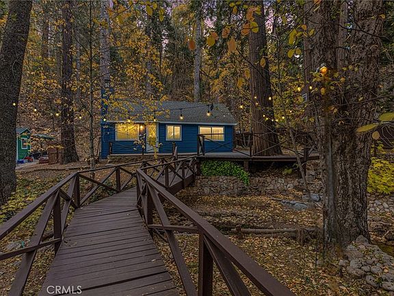 Tucked away along the peaceful banks of a bubbling creek, this charming two bedroom, two bathroom, 1929 cabin offers a timeless retreat in the picturesque town of Blue Jay. Surrounded by the natural beauty of the San Bernardino Mountains, this home combines historic character with modern updates, making it the perfect escape for relaxation and outdoor adventure. Thoughtfully updated with newly installed wood floors, fresh carpet and paint, and new stainless steel appliances, this home maintains its original charm while offering all the comforts of modern living. The spacious living room, anchored by a cozy fireplace, is ideal for relaxing on cool mountain evenings. A large bonus family room provides plenty of space for gatherings, and the updated kitchen, featuring sleek stainless steel appliances and newer cabinets, flows seamlessly into the gathering areas. Both bedrooms are generously sized, while the two 3/4 baths provide comfort and convenience for both residents and guests. Dual-pane windows throughout enhance energy efficiency, filling the home with natural light while framing picturesque views of the surrounding trees and creek. A few steps down from the level parking area, you'll cross a storybook wooden bridge that leads you over the creek right to the front door, adding to the home’s charm and welcoming entrance. The expansive backyard is perfect for outdoor dining and entertaining, surrounded by mature trees that explode with vibrant colors in the fall. Whether hosting a dinner party, enjoying an afternoon meal outdoors, or relaxing by the creek, the outdoor space offers a private sanctuary to enjoy nature’s beauty. Level parking for up to 3 cars ensures ample space for both residents and guests. Located just minutes from Blue Jay Village’s charming shops, restaurants, and attractions, this creekside retreat combines the allure of a vintage 1929 cabin with the comforts of modern living, all in a peaceful, idyllic setting.