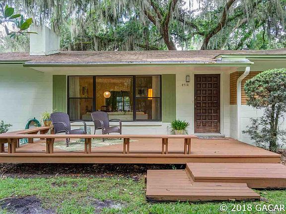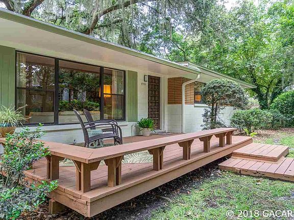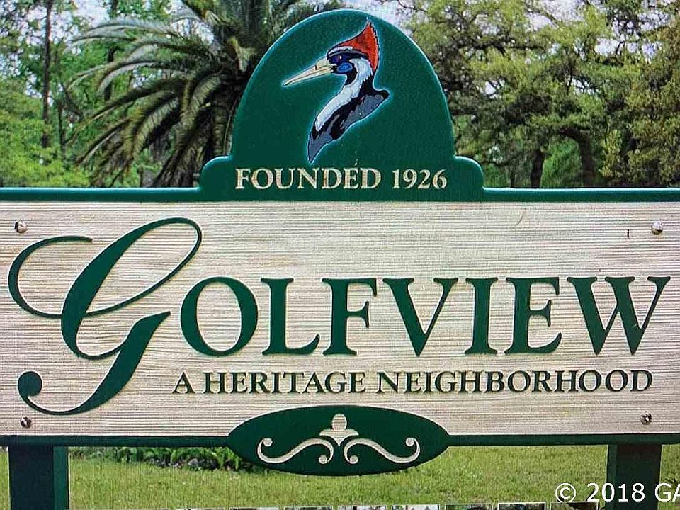 Just reduced! Mid-Century ranch home in Golfview, a centrally located neighborhood steps from the University of Florida. Enjoy living within walking distance to campus in a small historic community adjacent to Mark Bostick golf course. This exclusive neighborhood is distinguished by its tree-lined streets, diverse architecture & rolling hills. This family home features 3 bed/2 bath, expansive living areas including a formal living room with wood burning fireplace, a large wood paneled study with great natural lighting and an oversized Florida room. Hardwood floors throughout. Bonus 500 sf attached storage room with tons of potential as a playroom, home gym, workshop, art studio or mother-in-law suite. Located on a corner lot w/ beautiful views from all rooms. This home has been lovingly maintained with its mid-century character & charm well -preserved. Newer roof and HVAC. Recently re-plumbed. Carport features space for 2 cars plus room for a golf cart or boat. Golfview is zoned for top-rated Finley, Westwood, & GHS. Very rare opportunity to reside in Golfview!