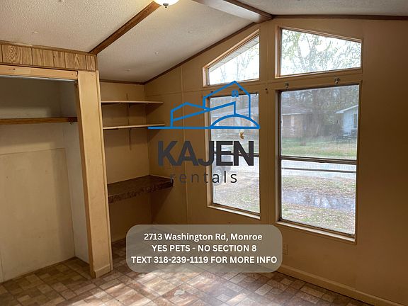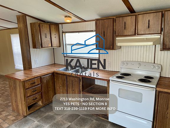 Please read the following information prior to contacting us as this should answer most questions. -No Section 8 -Yes Pets (With $200 non refundable pet fee and monthly pet rent) -No rent to own -No smoking inside -Rent is $650.00 -Deposit is $550.00 -Income will be verified on each tenant. -This is a mobile home. -Central Heat and AC. -Located at 2713 Washington Rd, Monroe --You provide refrigerator --We provide stove -3 bedroom 2 bath home. -You pay utilities (water, electric, trash, lawncare) 50 background and eviction check per adult ) --Add on options to Resident Benefit Package can include: On Demand Pest Control: $10/month.