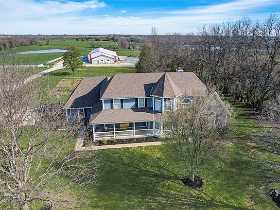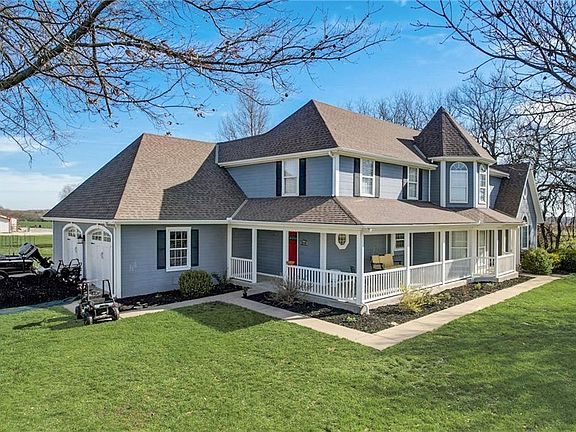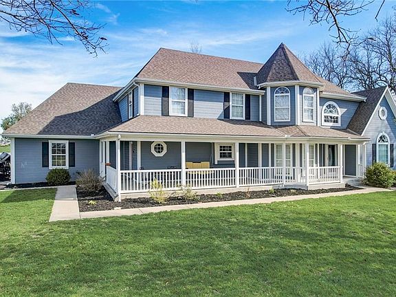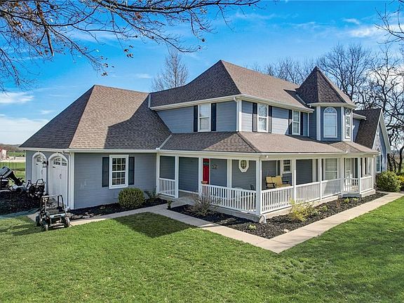Charming Spring Hill Johnson County 1.5 story home sits on 3.8 level acres with a long, grand driveway. Beautiful wrap around porch wleads to a vaulted entryway and formal dining room. The main floor also includes a large family room with an amazing fireplace and a wall of windows that overlooks the backyard and oversized patio. The kitchen is spacious and vaulted and houses an amazing kitchen island with tons of counter space and cabinets below. The kitchen has LOADS of cabinets and hard surface counter tops. It also has a large breakfast area with plenty of room for a large table. The main floor master has brand newer carpet and into the master bath. It includes a long double vanity, separate tub and shower and a convenient laundry room. Upstairs you wil find 3 spacious bedrooms and a jack-and-jill bath. One of the bedrooms would be a perfect office/school room/bedroom because of its good wall space and skylights. The finished basement has so much space and includes a wetbar, media room, kids hide-away room, a secret room behind the bookcase, another office/playroom, 2 additional non conforming bedrooms and a full bathroom w/2 showers! This is a fantastic location close to highways and schools. The large acreage and building behind this house is owned by a neighbor so no current plans for building anything behind this property. Present owners had planned to build a small barn or workshop behind the home. There is plenty of room to build or add a tree line.