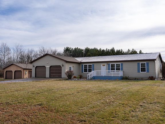 Welcome to this spacious 1,600 sq. ft. ranch nestled on 3 private, tree-lined acres. This well-maintained home with fresh interior paint features 3 bedrooms, 2 updated baths, an attached 2-car garage, and a versatile pole barn with new roof—perfect for additional storage or hobbies. Inside, the large open family room offers a warm and inviting atmosphere with its gas fireplace. The kitchen has been refreshed with new stainless-steel appliances, including a refrigerator, oven/range, and microwave along with new cabinets. Both bathrooms feature new vanities & toilets, and the primary suite includes a beautifully tiled walk-in shower. New waterproof vinyl flooring throughout much of the home. Additional highlights include a new sump pump & water heater, an unfinished basement ready for your personal touch, and a spacious deck ideal for relaxing or entertaining during the summer months. Move-in ready with plenty of potential—this property offers the comfort of rural privacy with all the conveniences of modern updates. Seller is a licensed Realtor.