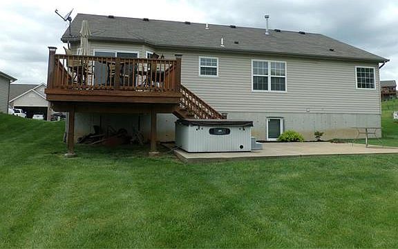 Beautifully built ranch home with Open 'floor plan. The front porch is 20 x 6 covered. Hardwood flooring enters, with oak and white spindle staircase, recessed lighting in Great room with Vaulted ceiling. A wonderful gas fireplace that was extended to mount TV above (with cable, electrical and phone jack outlet) Large Breakfast room which is bright and has a wonderful bay window leading to the deck. Kitchen and breakfast room have ceramic tile. Walk out the 12 x 10 deck with wide stairs. Custom kitchen has an abundance of cabinetry w/a lazy susan, and extended counter top. Bedrooms/great rooms have ceiling fans, with double switch plate controls, cable and phone jacks. Master bathroom has a double vanity, garden tub, separate shower, and a large walk in closet. Main floor Laundry is great! Large level let, and sidewalks. Vinyl tilt in windows. Elegant coach lighting. Triple window in front bedroom. Side walk out on garage.Wonderful garage, and well taken care of yard!