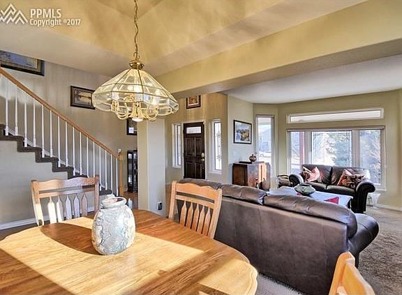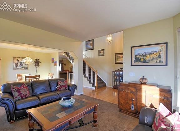 Situated on ¼ acre cul-de-sac lot in Creekside w/AMAZING views, this beautifully landscaped 6BR/4BA/3C two-story home is awaiting new owners! You are greeted by a wonderful blend of casual & formal living spaces on the main level. Formal living/dining room, upgraded kitchen featuring granite counters, decorative tile backsplash, newer garbage disposal, island, under mount sink w/upgraded faucet, refurbished original cabinets w/new stain, breakfast area w/wood flooring & sliding glass door w/walkout to the back deck. The kitchen opens to the great room w/fireplace featuring decorative tile matching the kitchen backsplash. Completing the main level is a laundry room w/closet, bedroom & sparkling ¾ bathroom. The upper level boasts the master retreat featuring a 5pc bath w/heated tile flooring & jetted soaking tub. Three additional bedrooms & a full bathroom complete this level. Let the finished walkout basement w/French doors which w/o to the large patio & arches throughout be your entertaining hub with a 2nd family room w/wet bar, computer/study area w/built-in desk, bedroom, ¾ bathroom & office/flex room. Additional interior features include matching tiled floors, upgraded carpet/pad throughout, window coverings included, Hunter Douglas blinds, energy efficient & easy to clean windows, energy efficient doors and plenty of storage! Exterior features include newer roof in Dec 2014, New Stain on Back Fence, Fresh Exterior paint & insulated garage doors. Wonderful professional landscaping to include in-ground sprinkler system, new composite deck, wired for hot tub, new patio area & professionally treated greenery. Award winning District 20 schools, close to Powers Blvd, Briargate Pkwy, I-25, shopping, restaurants and more, this home will not last long!