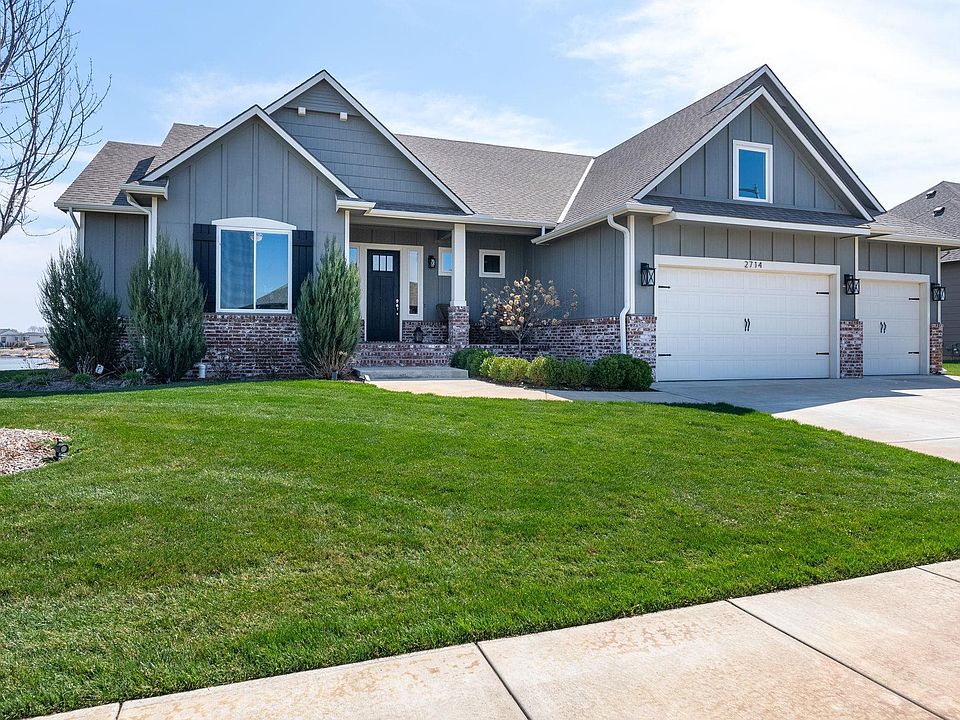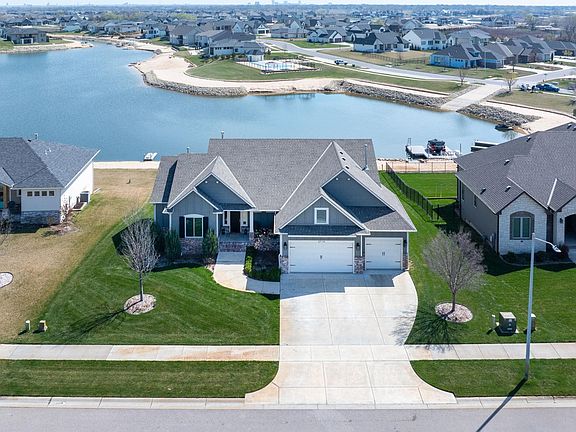 Lakefront living at its best! This gorgeous Sandcrest home with gleaming wood floors, soaring vaulted ceilings, and impressive wood beams is timeless and will impress the most sophisticated buyer. Inside you'll be greeted by the sprawling vaulted great room, featuring a stone fireplace and large windows facing the water. The gourmet kitchen is open, spacious and filled with storage - the perfect place to cook while you entertain. The adjacent dining nook features stunning water views and opens to a large deck. In the master bedroom, enjoy breathtaking sunrises over the lake. The master bathroom features double sinks, a tiled shower and an oversized walk-in closet. The closet adjoins the laundry room for added convenience. The main floor is completed by two more sunny bedrooms with large closets and plenty of light, as well a jack-and-jill bath, and a powder room. In the upper level you'll find a spacious fourth bedroom or bonus room, with charming architecture and an adjoining full bath and walk-in closet. The walk-out basement is the perfect place to relax, play games or host friends and family, and boasts easy outdoor access. Its generous layout includes a fireplace, custom accent wall, wet bar, storage room as well as space for a dining or game table. Two bedrooms and a full bath complete the basement. Located in one of Wichita's premiere lake communities, Sandcrest, this lake community not only accommodates water-skiing, jet skiing, and pontoon boating, along with all the other non-motorized lake activities, it also boasts a large clubhouse, pickle ball court, playground, and two area swimming pools. This picturesque home is conveniently located close to top schools, shopping and dining. Plus enjoy a sandy beach, and private dock right out your own back door (the dock is included with the property). This is indoor/outdoor living at its finest, with two outdoor living areas and a walk-out basement that makes entertaining a breeze. This gorgeous lakefront home is ready for all the summer fun!