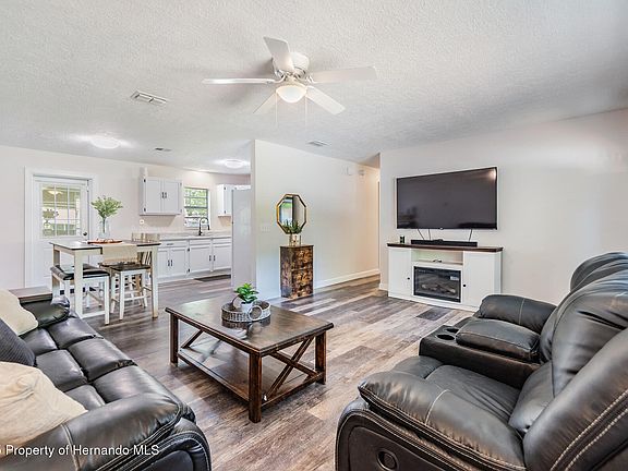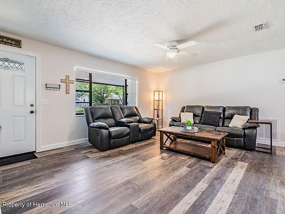 Welcome to this inviting 3-bedroom, 2-bath home with a flex room in the heart of Brooksville's Hill 'n Dale neighborhood. This home offers the perfect blend of comfort, convenience, and style. Step inside to find a bright and airy living area, filled with natural light from large windows. The open kitchen features wood cabinets and newer countertops, offering plenty of space for cooking and entertaining. The adjacent dining area is ideal for enjoying meals and making memories. The primary suite is generously sized, complete with its own private en-suite bathroom for added convenience. Two additional bedrooms are versatile and can be used as guest rooms, a playroom, or a home office. The guest bath includes a shower/tub combo for functionality. The flex room is a great additional space, perfect for relaxing, a playroom, or enjoying a good book while taking in the Florida sunshine. Outside, the spacious fully fenced backyard is perfect for outdoor activities, gardening, or simply unwinding. Two storage sheds offer extra space for tools and equipment. The oversized one-car garage provides ample room for parking and storage.