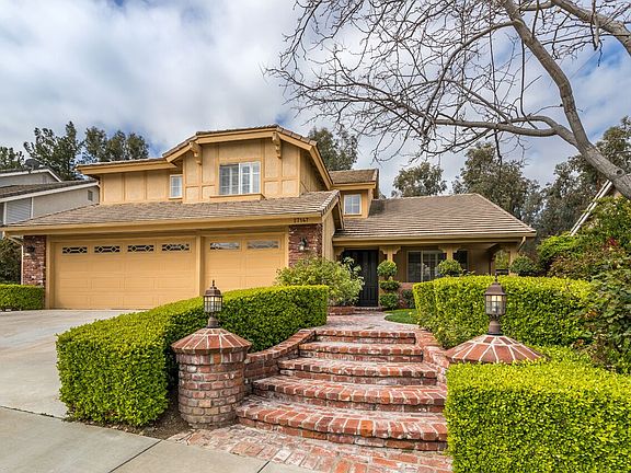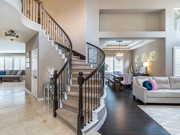 This beautiful home is a true showstopper! Gorgeous 4 bedroom plus pool and spa on a quiet cul-de-sac in Valencia Northbridge. Home features 2895 SF with 3 bedrooms upstairs and one bedroom downstairs equipped with custom built-ins for a wonderful home office. The open kitchen includes gorgeous quartz counters, upgraded custom cabinets with pull outs, tons of counter prep space, and tons of windows overlooking the backyard pool. You cant miss the stunning light fixture and spiral staircase in the formal entry. The whole house has been newly painted and remodeled with high end upgrades throughout, light fixtures, beautiful quartz counters, travertine flooring, newer paint, newer carpet, molding, and brand new window shutters. All bathrooms are beautifully remodeled. The fireplaces in this home are beautiful and tranquil, one in the family room with a gorgeous white granite surround and a dual-sided fireplace in the master bedroom and master bathroom. Relax in the backyard with a pool and spa, and large entertaining area, and at side of home room for trailer toys or for lots of play. This large home is a rare find with plenty of additional areas for storage and a 3 car garage. Located in the heart of one of Valencia's most favored neighborhoods. There are wonderful parks, miles of walking paths, award winning schools, and shopping all within short walking distance. The HOA is very low and the amenities include paseos, tennis courts and pools. All of this and NO MELLO ROOS!