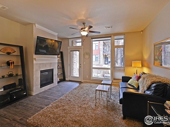 Move in and enjoy Urban Style living at the Flats at Rigden Farm! This stylish main level condo boasts numerous fine appointments including hardwood flooring, quartz counters, gas fireplace and upgraded cabinets just to name a few. Right outside the private front entrance, enjoy a sunny front porch which overlooks community greenspace. In unit laundry room and attached garage and secure building are additional conveniences you'll appreciate. Steps away you'll find a small retail village which includes ---groceries, dining, shopping, mail services and more! The central location provides easy access to Old Town or even I-25 if needed. Lock and leave if you so desire as HOA covers building maintenance, grounds maintenance, water, sewer, trash, basic cable and hazard insurance too. Don't miss this rare opportunity!