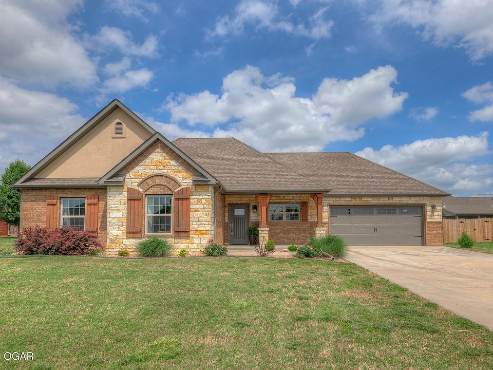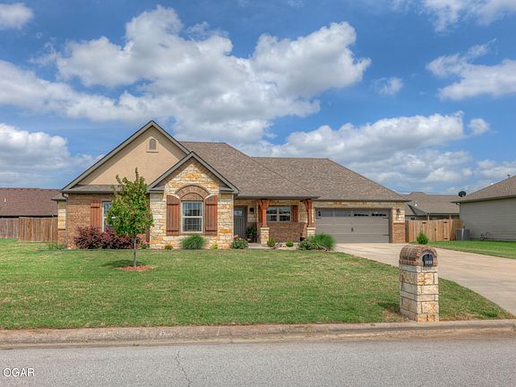 Excellent location & elegant style make this home a keeper! Mayberry Construction with all the extras in this well-maintained home. The curb appeal hits all the right notes with a brick & stone front, covered front porch, and tidy landscaping. Inside you'll find a beamed, cathedral ceiling and warm rich wood floors. The living room leads to a large back patio for quiet evenings at home. The kitchen has granite counters, stained cabinets, & has all appliances. The master bedroom carries the theme with a beamed ceiling & a luxurious master bath w/ bowl sinks, dual vanity, tiled shower, & a soaking tub. The floor of the master closet opens up to a storm shelter for peace of mind. The two guest bedrooms are roomy and have nice closets. A wood privacy in the back yard completes the package.