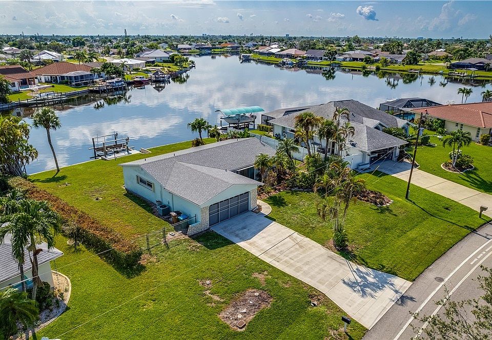 Welcome to your GULF ACCESS paradise! Nestled on an oversized lot with a breathtaking BASIN VIEW, this home offers stunning open-water vistas from the moment you walk through the door. Boasting a new ROOF (2023) and a new BOAT LIFT (2023), this property is move-in ready for your waterfront lifestyle. The light-filled Great Room features two sets of French doors that open to the outdoor sitting area, while the split floor plan ensures spacious bedrooms with generous closet space. Inside, you’ll find UPDATED bathrooms, modern light fixtures, and low-maintenance laminate and tile flooring throughout. Outside, the tropical landscaping, FENCED yard, and hurricane protection—including an ELECTRIC SHUTTER at the front door and ACCORDION SHUTTERS for the rest of the home—provide both beauty and peace of mind. The property includes a 104-ft seawall with a concrete dock and a new 9,000-lb BOAT LIFT with remote control—perfect for fishing, boating, and soaking up the Florida lifestyle. Additional features include a TILED GARAGE with a sliding SCREEN for the garage door. Conveniently located in a quiet neighborhood, this home is close to everything Cape Coral has to offer. Don’t miss your chance to enjoy sunshine, water views, and the ultimate coastal living—schedule your showing today!