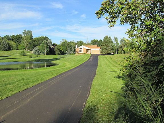 Ranch with finished walkout basement overlooking 1/4 acre pond on 2.5 acres. Large master bedroom bath with skylight over an oversize corner spa tub and large walk-in closet. Brand new asphalt driveway. Newer roof. Wallside windows with 35 year transferrable warranty. Newer 90+ natural gas furnace with humidifier, AC, and high efficiency air purifier. Brand new high efficiency power vented gas water heater. Mechanic/car collector's dream with matching 32x48 insulated/heated pole barn with 14 ft ceiling, 3 large overhead doors,10K lb capacity car hoist, and 200 amp service. *2.5 BAC*