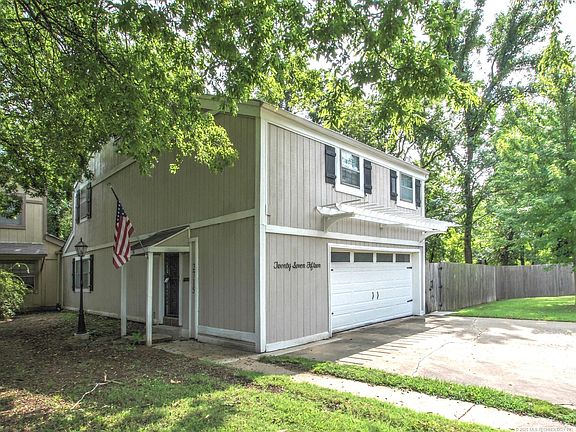 Updated Condo in convenient, Tulsa location. Full kitchen gut & remodel, 2016. Exotic granite, farmhouse sink, huge peninsula, tile backsplash, under counter lighting & matching appliances. All appliances stay! Open living/kitchen/dining floor plan with wood burning fireplace. Luxury plank vinyl flooring on lower level. Huge Primary bedroom upstairs with double closets. 2 car attached garage. Nice deck & small, private, fenced yard that backs to creek and wooded area. Great home! Great price! Call today!