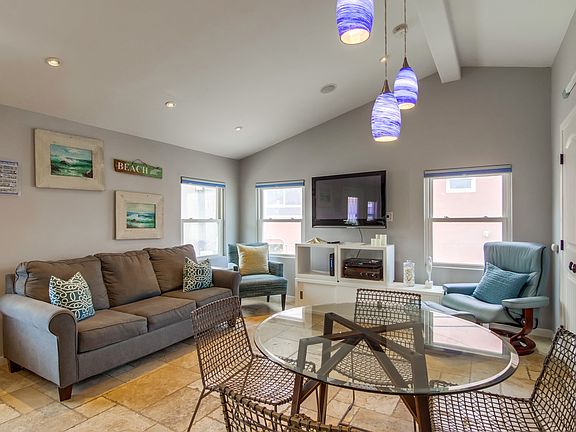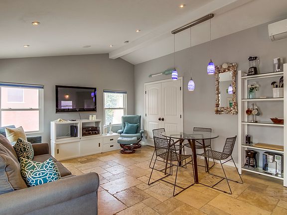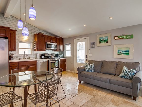 Looking for luxury in Mission Beach, but aren't in need of a large vacation rental? This one-bedroom rental is perfect for a couple or a family of four. This home is located one house back from the ocean, on the second floor above the garage, with a private entrance. The main living area is opened by a comfortable couch, flat screen TV, dining for four, and a fully equipped kitchen. The high ceilings and recessed lighting make this space cool and comfortable. The Air Conditioning unit easily maintains temperature, if needed during the warmer summer months. The kitchen is stocked with everything you'll need to feed the family, such as high-end appliances, cookware, glasses, dinner sets, and utensils. Just bring the family chef!