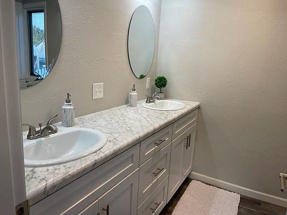 Complete remodel of main level bathroom with double vanity/sink and large linen closet.