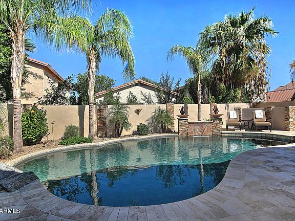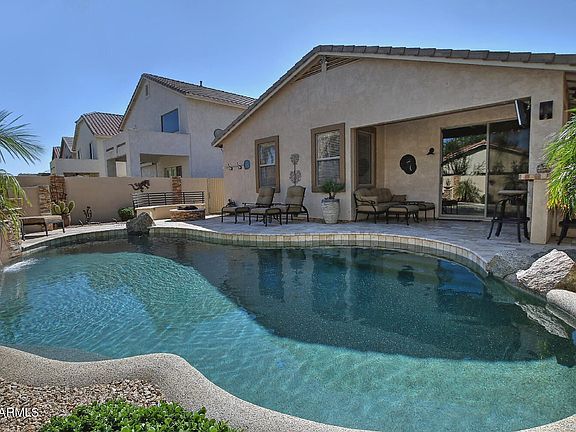 Welcome Home to Comfort & Quality! Stunning Pool & Extraordinary Outdoor Entertainment Area is the Perfect 10. Spacious Living & Dining. Upgraded Vaults, Lighting & Ceiling Fans, Tile & Granite. Inviting Neutral Decor. Well Appointed Kitchen with Vaulted Ceilings, Spot Lighting, Granite Counters & Island. Stainless Appliances included. Great Room Open to Kitchen with Slider to the Stunning Patio with Built-in Cook Center, Barbecue. Enjoy Relaxation on the Travertine Patio, next to Sparkling Pool & Waterfall, and Built-in Seating with Gas Firepit. Primary Bedroom Boasts Spa Like Bathroom Suite. Split Floorplan Offers 2 additional bedrooms & Luxurious Guest Bath. Full Laundry Room, with Washer/Dryer. Epoxy Double Garage, Built In Cabinets. Beautiful Plush Carpet. Gated Golf Course Community!