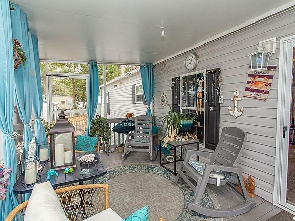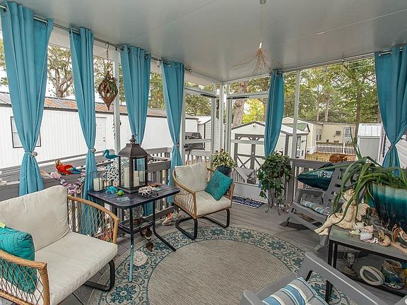 This charming manufactured home, built in 2020, offers 2 spacious bedrooms, 2 full bathrooms, and an inviting open-concept living area with luxury vinyl plank flooring throughout. The kitchen boasts stunning dark cabinetry, a stylish upgraded backsplash, and sleek stainless steel appliances. Step outside to enjoy the 11x16 screened porch, complete with a wheelchair ramp for easy access. The property also includes two detached storage sheds and a cozy fenced area with a fire pit—perfect for outdoor gatherings. Just a short golf cart ride from the beach (less than 2 miles), with quick access to Highway 17. Ideally located near Myrtle Beach State Park, Market Common, shopping, and the airport, this leased land community features a picturesque lake, perfect for kayaking and fishing.