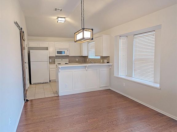 This home in the Deerfield subdivision in East Norman has an in-ground storm shelter in the garage and wood flooring throughout the main areas of the house. It has a light and airy color scheme and a popular open-concept design that places the dining area between the kitchen and living room, keeping all three spaces open to each other as well. The functional, U-shaped kitchen features clean white painted cabinets, a double-basin sink beneath a window overlooking the backyard, and a modern sliding barn door for the pantry.
