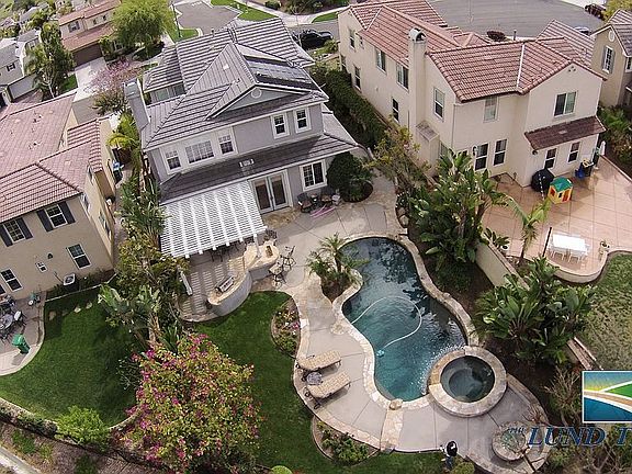 Extraordinary backyard oasis set within rare, oversized yard in Bressi Ranch. Solar heated pool w/ Pebble Tec finish, waterfall spa & fire ring sitting area set amidst expansive protected nature preserve. Also: built-in entertainment bar & BBQ! Granite island kitchen floorplan w/ stainless steel appliances & wood cabinetry. Three large bedrooms up w/ optional office/game room. Downstairs added guest room/office with luxurious bathroom including full steam. 3 car tandem garage, A/C & refrigerator, washer and dryer are included! Walk to clubhouse, shopping, top schools, Alga Norte Park, trails & more! Video tour: https://youtu.be/IQ7j6KCp-i0