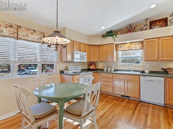Easy living meets elegance in this charming southwest Colorado Springs gem. Enjoy the convenience of main level living in this well-maintained, one-owner home that exudes pride of ownership. The open and airy great room concept with vaulted ceilings creates a light-filled atmosphere, making every corner inviting. Cozy up by the gas fireplace, surrounded by custom built-in cabinetry, adding a touch of warmth and character to the living space. A spacious owner's suite features an adjoining bath and a walk-in closet, providing a serene retreat. Eat-in kitchen boasts all appliances included and gleaming hardwood floors. French doors lead to a 2nd bedroom or flex space with closet. Charming and efficient office features custom built-in desks, fireplace and walk out to private covered back patio, complete with a retractable awning – a perfect spot for morning coffee or evening relaxation. The small fenced backyard is adorned with perennials and shrubs, creating a tranquil oasis. Convenience is key, as this residence is strategically located near shops and restaurants, Cheyenne Mountain, and I-25. Hardwood floors, 6-panel doors, and thoughtful design elements enhance the overall appeal of this home. Embrace low-maintenance living without compromising style. This is a small, 18 unit self-managed community with little turn over, so don't miss the opportunity!