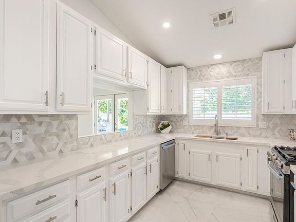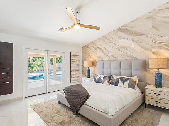 Active Under Contract - Accepting Backup offers. Designer renovated behind gates! Low HOA. Completed in 2024. Step inside to discover every room adorned with 36' Italian luxury tiles. Valued ceilings throughout give a spacious, organic feel that blends with the outdoor space. The kitchen, a culinary enthusiast's paradise, features a dual-waterfall quartz countertop, an integrated workstation sink, modern faucet, and the latest appliances. Host gatherings beside the marble fireplace or impress guests in the remodeled bathrooms. The spacious master suite boasts an eye-catching feature wall, and walk-in closet equipped with custom cabinetry. Recessed LED lighting with dimmer controls, innovative DC variable-speed ceiling fans, and a smart WiFi thermostat. The secluded backyard includes a pool and spa, pool deck coated with cooling technology, and a Pentair heater. Evening ambiance is ensured with LED garden lights and mature greenery, which the HOA maintains at the front (low maintenance for you!) The 2-car garage has epoxy floors, built-in cabinets, and a stainless steel work sink. Keyless entry lock with fingerprint technology. Located at the Palm Springs edge within the secure, charming Shadow Crest community--where a $385/month HOA fee includes access to a large communal pool, tennis courts, and lawn care (water included)--this home epitomizes the seamless blend of luxury, design, and convenience. Its prime location ensures easy access to shops, schools, and the freeway