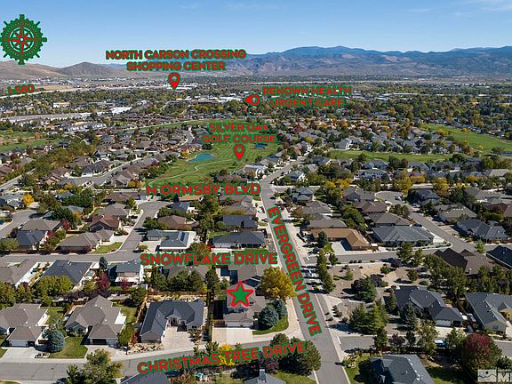 Make a list and check it twice; this home has everything nice on that Christmas list—2713 square feet, 4 bedrooms, 3 bathrooms, and a 3-car garage on 0.22-acres in the Silver Oak neighborhood. It has been wrapped with newer flooring and interior paint and decorated with a recently remodeled kitchen and family room. Usher in the holiday season by submitting a winning offer before the Grinch steals it, and close escrow quickly so you’ll be home for Christmas this year on Christmas Tree Drive., String Christmas lights from the facets of the façade of this two-story house and display joyful lawn ornaments on the front and side yards, fully landscaped including mature “Christmas trees” to even top with stars. From under the covered porch, scour the falling snow for the perfect snowflake. Warm up in the entry with walls and halls decked in the warmth of cozy decorations. Hang mistletoe from the chandelier and kiss this home hello. Watch Home Alone in the TV nook of the family room. Pour a goblet of egg nogg from the wine refrigerator at the wet bar. Set milk and cookies on the granite hearth and hang stockings from the wood mantle for Santa when he slides down the gas log fireplace. Cook a Christmas feast in the kitchen using newer General Electric stainless-steel appliances. Roast a classic roast and nuke if needed using the wall oven and microwave combination. Warm a pot of stock on top of the 5-burner gas range with hood. Rinse cookware in the single-bowl sink before washing in the dishwasher and send scraps down the garbage disposal. So bring me some figgy pudding from the French door refrigerator with freezer drawer. Gingerbread man cookies come to life and escape across quartz countertops with subway tile backsplash. Set the informal breakfast bar or kitchen nook, or a banquet table in the formal dining and living room combination, with Spode Christmas Tree tableware safekept in the kitchen’s newer soft-close cabinets and drawers. Gather in the living room around a lit Christmas tree and enjoy listening to Christmas classics or for Christmas carolers, the high ceilings pleasantly enhancing the acoustics. The secondary floor’s primary suite presents light and airy. The bedroom’s elevated north and east facing windows capture captivating views of the Pine Nut Mountains and let in the rising sun’s light and outside air. A vaulted ceiling with fan and alcove expands the expansive room upward. Utilize the utility of the proximate reach-in closet or the distal walk-in closet beyond the ensuite finished with dual vanity sinks, shower stall, jetted tub, and water closet. Of the three guest bedrooms, the one downstairs has a walk-in closet and is adjacent to the hallway bathroom with shower stall and single vanity sink. The remaining two guest bedrooms are upstairs: one with westward mountain views, vaulted ceiling with fan, and walk-in closet, and the other with views north and reach-in closet. These bedrooms are connected by a Jack-and-Jill bathroom with dual vanity sinks, linen cabinet, and privacy water closet with bathtub and shower combination. Wash Santa’s suit in the laundry room with 220v and gas hookups, sink, cabinet, and folding counter. Park up to three sleighs in the garage with a wall partition separating two spaces from the third. Tinker on toys at the work bench and tend to the house’s heat sources in the mechanical closet. Build a snowman in the back yard and grab a carrot for a nose from garden beds. Create snow angels on the grass lawn and throw snowballs from the cover of mature trees. Welcome to the esteemed Silver Oak neighborhood in the Northwest area of Carson City. Governed by CC&Rs and under the governorship of The Silver Oak Community Association, a nominal HOA fee of $80 billed quarterly buys you only common area maintenance. Instead of being teed off, take out your stress and tee off across 18 holes or driving range at the neighborhood’s anchoring Silver Oak Golf Course (˜1.1