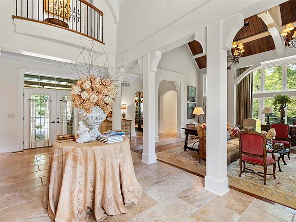 & the cabinetry throughout is divine. Entertain with ease as the floorplan is open, bright & inviting, where each space makes a statement that is both welcoming & distinctive. The kitchen-breakfast area blends easily with the adjoining great room & is luxuriously equipped with high end appliances, two large islands, stacked cabinets with a variety of door & hardware treatments & twin frig/freezer. Custom beams & vaulted ceilings, unique bar/wine room with glass lit wine storage & cabinets, & main floor primary suite that is something out of a dream. Three sets of French doors to tongue in groove covered outdoor room with fireplace overlooking romantic grass edge pool & private lot. Walk-out French doors from the lower level too! Additional Rooms: Mud Room, Wine Cellar