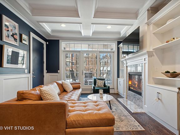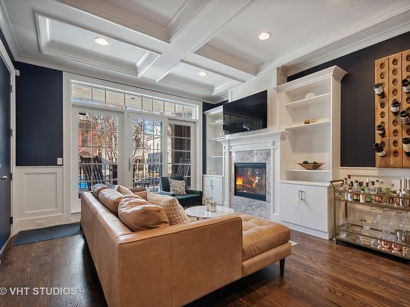 Stunning 4 bedroom duplex-down. Sleek modern finishes, tall coffered ceilings, and beautiful hardwood floors on main level. Enter into the living room with gas fireplace and built in shelving, open to the dining area with built in bar and wine refrigerator. Half bathroom on main level. Continue on to the large kitchen with 6 burner Wolf stove, sub-zero fridge, island and eat-at counter open to bright and spacious family room with surround sound system. Lower level boasts heated floors and a gorgeous primary suite with walk-in closet, huge bathroom with double vanities and stand alone soaking tub and separate steam shower. 3 additional large bedrooms with a full hall bath. Laundry closet, and plenty of storage finish out the lower level. 3 different outdoor living spaces include a covered front porch, back porch AND a large private deck on garage rooftop. Exterior storage unit and garage space. You don't want to miss this spectacular unit!