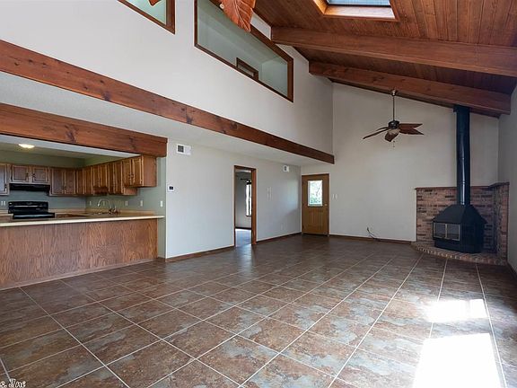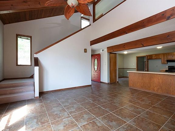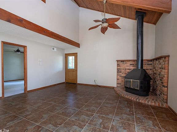 Open floor plan with lots of natural light in this contemporary home. Large living area with corner wood burning stove, flows into eat-in kitchen. Easily maintained tile flooring in all living and wet areas. Downstairs master has striking master bath and walk-in closet. The open upstairs corridor leads to guest bedrooms with Jack and Jill bath.