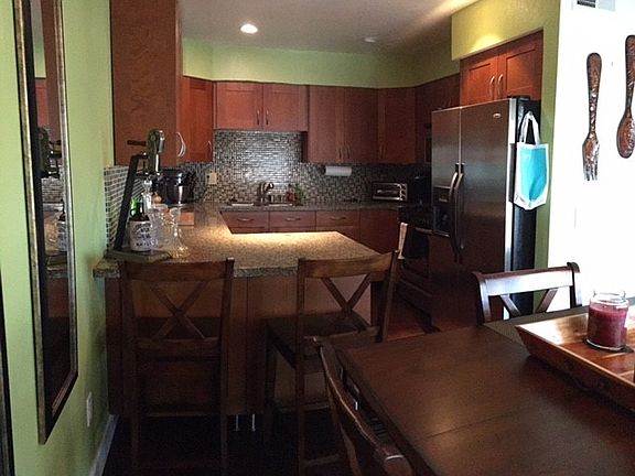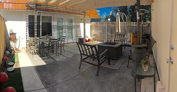 Single Story, private end unit with no-one above or below. Attached on one wall. The kitchen is totally remodeled and the floors are custom. Remodel includes cabinets, granite tops, stainless steal appliances and recessed lighting. Cement polished floors, except for the 2 bedrooms. and 2 fans installed. Backyard patio has covered trellis with permits and stamped concrete deck. All windows are newer dual pane vinyl. Aluminum slider removed and French doors installed. upgraded window treatments.