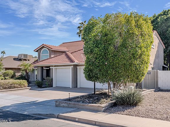 Beautiful two story stucco home featuring a double ensuite floorplan, with one bedroom and a full bathroom located downstairs. Upstairs you will find a primary suite and two more bedrooms. Living area features vaulted ceilings, bay windows, plenty of natural light, and wood-burning fireplace in family room. Eat-in kitchen is complete with stainless steel appliances, tiled backsplash, plenty of cabinet and counter space, breakfast bar, recessed lighting, and picture windows with a perfect view of the backyard and swimming pool. Located in a highly desirable Chandler neighborhood with no HOA, and within walking distance to Amberwood Park and Chandler Traditional Academy-Goodman Campus. This home has a lot of potential! Come see it today!