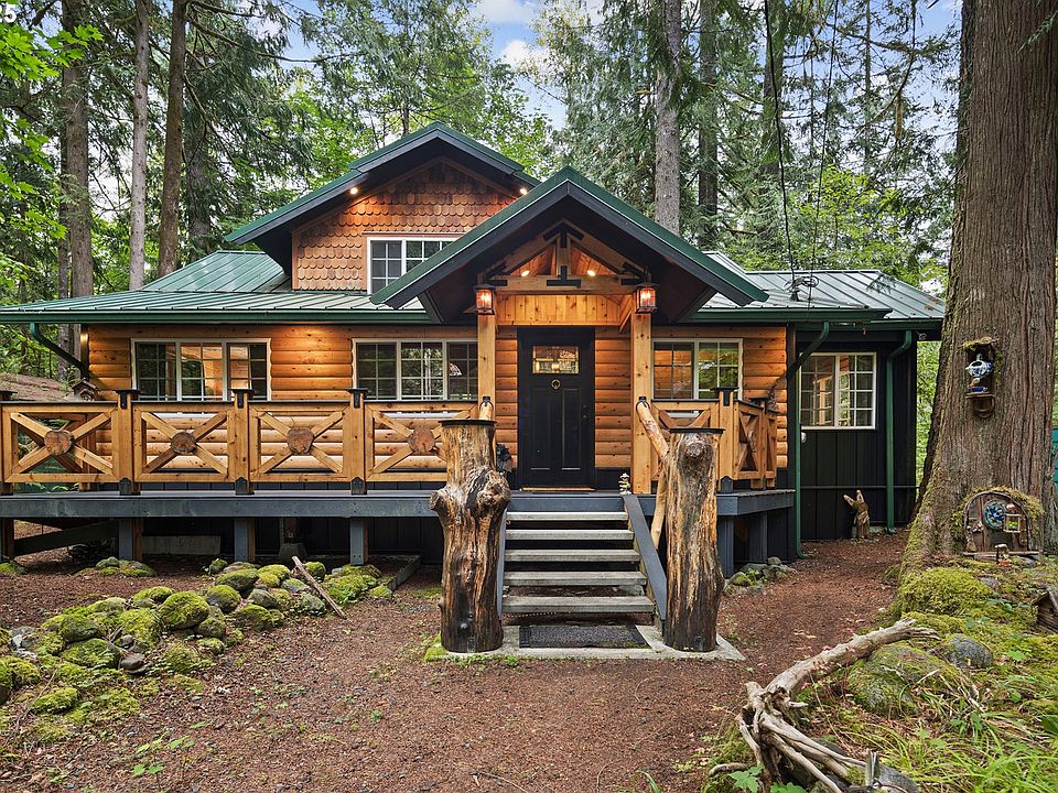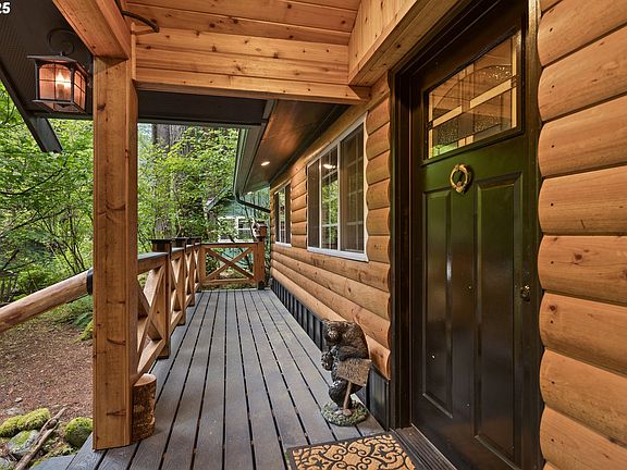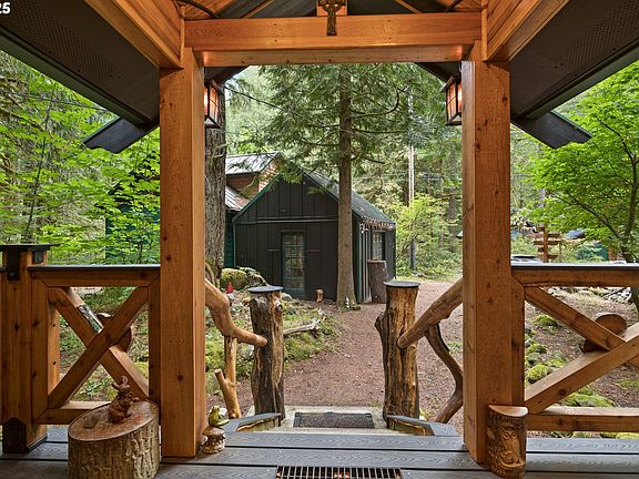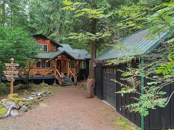 Discover a rare piece of Mt. Hood history in this 1930’s Steiner-built cabin, beautifully updated for modern comfort while embracing its original charm. Situated on a wooded .23-acre lot between the Zig Zag River and Still Creek, this fully-furnished 4 bedroom retreat is ideal as a full-time home, mountain getaway or turnkey vacation rental.Inside, original Steiner wood floors and a striking stone fireplace anchor the cabin's rustic character, with one bedroom featuring authentic log wall finishes in true Steiner fashion. The main level offers three bedrooms and two full baths, while upstairs adds a sleeping loft (4th bedroom) and cozy office. Tasteful updates in the kitchen and baths complement the warm wood paneling for a true mountain lodge feel.Outside relax to the babbling of the river below from the spacious deck with custom-built sauna, fire pit, and cold soak tub. A detached garage/workshop, private nature path, and artisan details complete the property. Whimsical handcrafted gnome doors -created by the owner/founder of Rhododendron's beloved Gnome Way- are tucked throughout the landscape and add an enchanting touch.The exterior has been updated with low-maintenance, durable finishes including metal roof and siding and composite decking, all ideal for mountain living. Nearby, a footbridge links you to Rhododendron shops and eateries, with Mt Hood skiing, hiking, and fishing just minutes away.Historic, artistic, and inviting - this cabin is truly one of a kind!