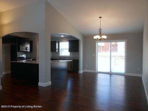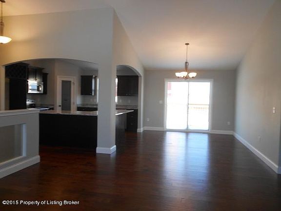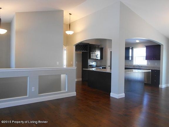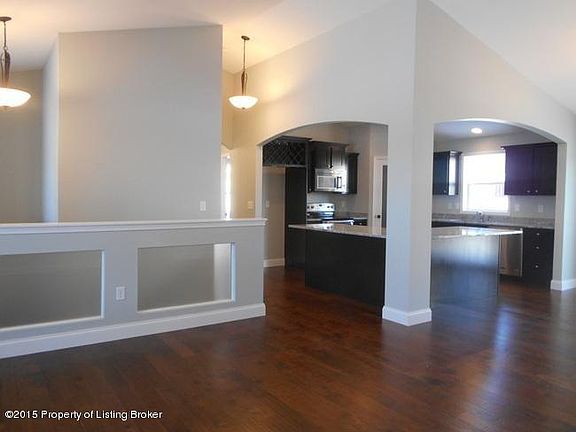 RV parking pad on South side of driveway and white vinyl fence. Large open plan ranch style home from Dickinson's premier home builder True Style Homes. Large covered front porch entrance graced with front columns. Soaring cathedral ceiling, engineered hardwood flooring, Pella windows,