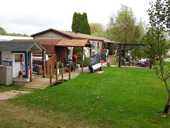 Economical living! This mobile home in Delbrook Estates has a lot to offer. Quiet home on cul de sac. Great layout with 3 BRs, laundry area, large open living room & kitchen. Sunroom on the front of the house was added in 2009. A larger rear room was just added. Kitchen was completely remodeled in 2010, all new cabinets and flooring, a walk-in pantry was also built. The living room, 2 bedrooms and hallway all have new hardwood laminate flooring. Bathroom has new floor and sink/vanity. Newer roof, furnace & CAC. Nice lot backing up to trees & fields. Has been landscaped with fruit trees, and curly willows. A boardwalk stretches from the front of house to back of yard. Shed out back. Pets welcome. Must get park approval (lot rent is $350 per month), water, sewer and trash extra. Call or e-mail for more information today!