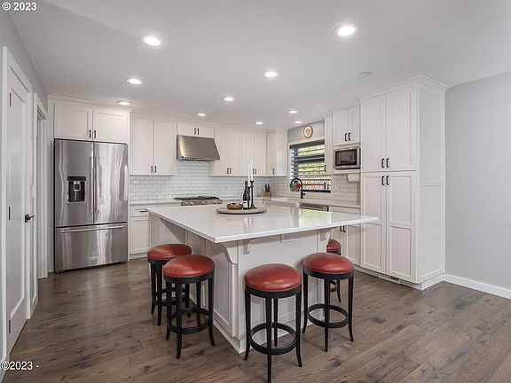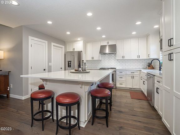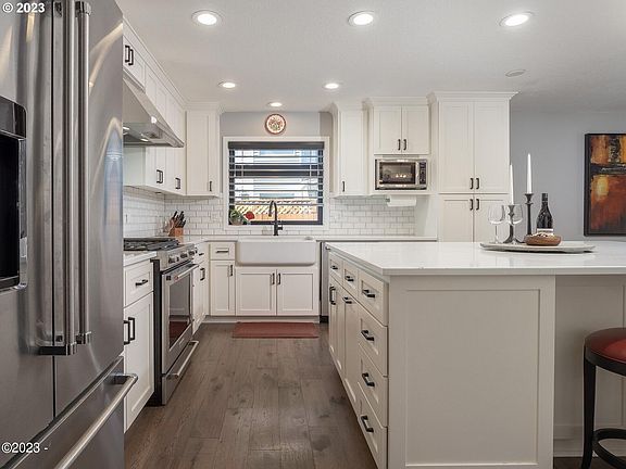 Beautifully remodeled single-level 4 bedroom home with an open concept floorplan. Stunning wide-plank hardwood floors flow throughout the entire home. The living room seamlessly connects to the dining room and custom kitchen, creating the perfect space for entertaining. The kitchen is a chef's dream with a huge island, quartz countertops, and top-of-the-line KitchenAid appliances. The soft-close cabinets, added lights and Shaw Fireclay Apron sink with touchless faucet add an extra touch of luxury to this already impressive space. Enjoy plenty of natural light with new windows, complete with Hunter Douglas blinds. The spacious primary bathroom already has plumbing in place for a freestanding tub. The new interior and exterior lighting create a warm and inviting ambiance. Stay comfortable year-round with the new furnace and AC unit. This home offers ample space for all your vehicles with an oversized garage, and RV or boat parking. Situated in a quiet neighborhood, this move-in-ready home is the perfect oasis. Don't miss out on the opportunity to make it yours!