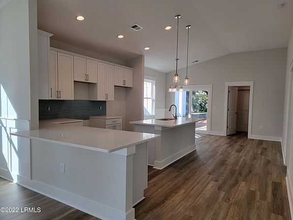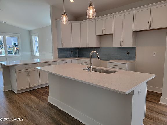 *Picture is not the subject property but of a similar property* Corner site with single story home. The Hampton packs a mighty punch of curb and interior appeal. Stacked stone, front porch, shaker accents are eye-catching and when you walk in the front door, the open plan with stellar upgrades will bring a smile to your face. The single car detached garage also has a carport. Features include Hardi Plank siding, LVP flooring, French doors to rear porch, Level 5 42'' estate-like soft-close cabinets, Quartz countertops t/o, farmhouse sink, pendant lighting, tiled shower in master with frameless shower door, blinds throughout and ceiling fans in the bedrooms. One of the last three homes in this charming community with community dock on Battery Creek!