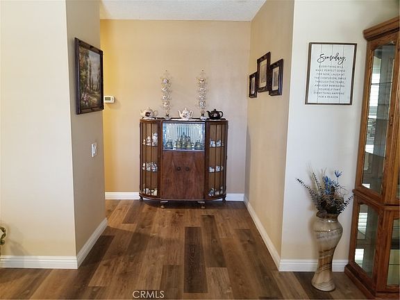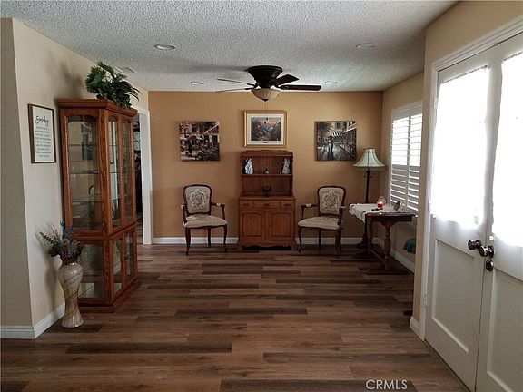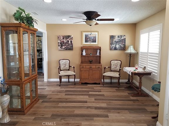 Lovely home, Retire in Style, largest most Deluxe model Presley built, plus it's been expanded. Now 2011 sq. ft. of spacious living. Upgraded kitchen, granite counters, added large walk-in pantry, plenty of kitchen storage, New Stove, oven never used. Large open family room, classy custom coffee bar space with window door. Large, beautiful stone fireplace. Newer easy-care flooring tastefully painted throughout. You are going to love this floor plan, large formal living and dining room. Great sized master bedroom, large closet space. Two additional bedrooms, currently one is used as an office, closet is set up for easy and efficient storage. Upgraded new vinyl white fence. Hugh covered Patio faces East, morning gentle sun, afternoon shaded by Alumna wood cover with 2 fans and light combo. Perfect area for barbecuing and entertaining family and friends. Upgraded garage door, freshly painted exterior, Newer roof, with money saving solar panels. Replaced windows, Plantation shutters in Living Room and Family. Low maintenance yards, two storage sheds, out of sight located on the side yards. Sellers have made this home easy living, creating Plenty of time to enjoy retirement life. Quiet street, home is located in a small town, that meets all your needs, markets, banks, doctors, and a golf course. Very close to the Sun City Civic Association, offering 2 swimming pools, spa, exercise room many clubs, shuffleboard, lawn bowling, cards, games, woodshop, ceramic studio, Billiard room. Lots to choose from, Do a Little or Do a lot. A larger newer shopping center less than 10 minutes away, also access to the 215 freeway. THE PROPERTY IS IN EXCELLENT CONDITION SELLERS HAVE TAKEN VERY GOOD CARE OF THEIR HOME. Even had the chimney cleaned and inspected in May 2023