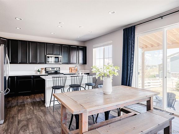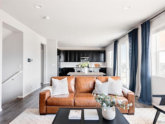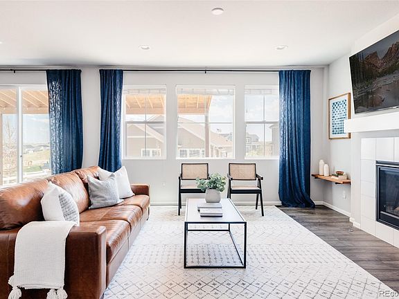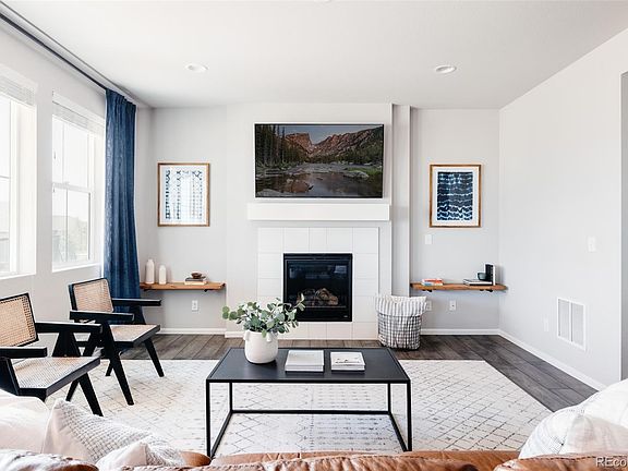 Exquisitely finished home in the Southshore neighborhood, a resident first, thoughtfully planned development adjacent to the Aurora Reservoir, which caters to Life at the Lake. Upon arrival you are greeted by a covered front patio that guides you into the home. Inside you’ll discover a spacious front foyer that leads to the open main floor living area where the living room, dining room and kitchen flow seamlessly together. The living room is centered around a modern gas fireplace accented with tile, a mantle and floating shelves on either side. The stylish yet functional kitchen is equipped with plentiful espresso cabinetry, a large island, newly installed white quartz counters, stainless steel appliances and large walk-in pantry to keep you organized. The dining room opens up nicely to the large, covered stamped concrete patio making entertaining a breeze. There are 2 large additional closets on this level offering plenty of storage space as well as a powder bathroom off the front entryway. Venture up the stairs lined with plush carpet to find 3 bedrooms including the primary, a secondary bathroom and a conveniently located laundry room. In the primary bedroom you’ll discover vaulted ceilings and a beautifully finished primary bathroom with dual sinks, decorative tile selections, a glass encased shower and a large walk-in closet. This home includes an unfinished basement ready for you to put your own personal touch on the home. Push back the slider to access one of the most amazing features of this home, the landscaped backyard - offering the perfect space for enjoying your time outdoors. Vivint security system included; the equipment is paid off it would just be a monthly monitoring fee of $40.