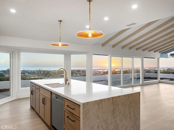 Welcome to 2719 Setting Sun Drive an extraordinary coastal sanctuary perched above the Pacific, offering unparalleled 300-degree ocean views from nearly every room. This completely remodeled residence blends timeless elegance with modern sophistication, capturing the essence of luxury living in Corona del Mar. Step inside to discover a light-filled, open-concept layout where expansive glass walls frame sweeping vistas from Catalina Island to Newport Harbor and Palos Verdes. The heart of the home is a designer kitchen featuring a waterfall-edge island, custom light wood cabinetry, quartz countertops, and high-end appliances. A marble backsplash and gold-accented fixtures add warmth and refinement, while dual-tone cabinetry and pendant lighting elevate the space with contemporary flair. The seamless indoor-outdoor flow leads to ocean-facing terrace, ideal for entertaining or quiet reflection. Whether you're hosting sunset gatherings or enjoying morning coffee with sea breezes, every moment here is infused with coastal serenity. The primary suite is a private retreat with floor-to-ceiling windows, spa-inspired finishes. Additional highlights include smart home upgrades, wide-plank flooring, recessed lighting, and a thoughtfully curated palette of natural textures and modern finishes. Every detail of the remodel was executed with precision, creating a home that is both visually stunning and functionally exceptional. Don't miss this rare opportunity to experience a coastal jewel with unmatched views and timeless design. Schedule your private showing today.