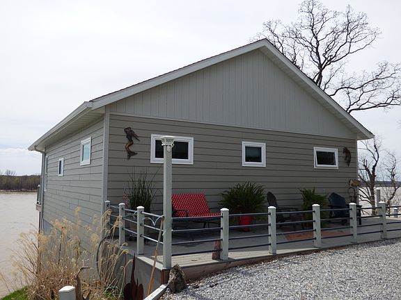 High on the bluff...overlooking the Mighty Ohio!...just outside the town of Cave in Rock in a small neighborhood. Close to Cave in Rock State Park. Free Ferry to Kentucky and Amish Country. About equal distance from Evansville Indiana and Paducah, Kentucky. First rate construction throughout: 2x6 outside walls, LP smart siding, vinyl insulated windows, composite decking, high end appliances, beautiful quartz counters in kitchen and bathroom areas (2 full bathrooms), solid hardwood flooring (maple) in all areas except entrance and baths (tile), Full high ceiling walkout basement, big wraparound decks. Views, views, and views...sunrise and sunset. The basement area is a fully finished walkout on the ground level. High ceiling, fully dry-walled, electricity, heat and air. It could easily be converted for use as a studio apartment, master bedroom, etc. At present it is wide open, so the new owner can configured it as he or she pleases! The area abounds in natural beauty, state parks, national forests...hunting, fishing (boat ramp in neighborhood), and hiking.