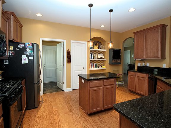- Kitchen: Pantry, Island, Cabinets-Natural, Floors-Hardwood, Recessed Lights, Backsplash-Granite