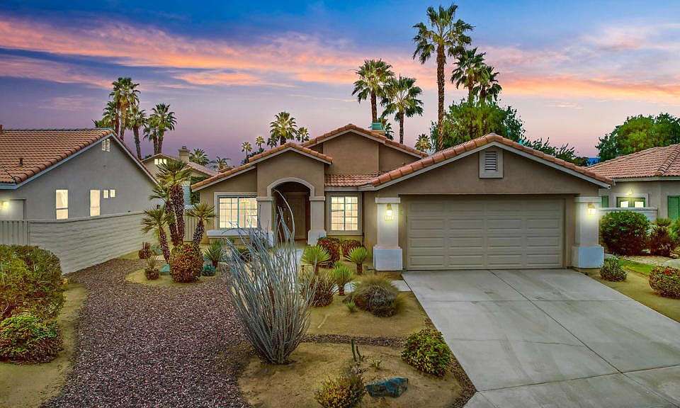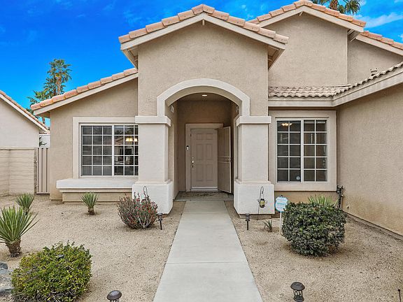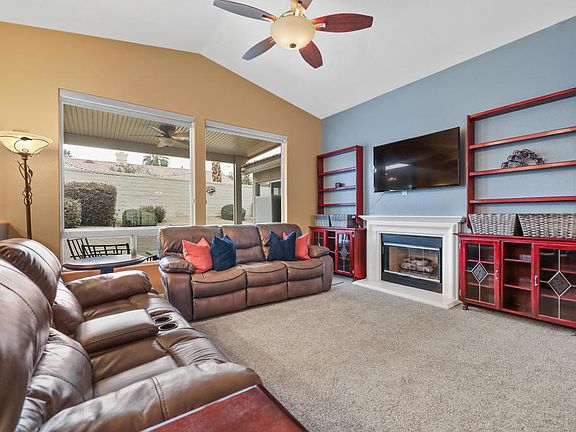 CONTEMPORARY Interior design with Open Concept featuring high-ceilings! Detached home located on quiet cul-de-sac, in PRIME Palm Desert central location behind gates of a fiscally managed HOA* of just $90 month! Many upgrades include kitchen cabinets, granite counter, sink and stainless appliances. Laminate flooring, newer carpet, bathroom granite counter tops, sinks, faucets and light fixtures. Custom blinds throughout, washer/dryer, water heater. Electrical panel and landscape improvements, and so much more. See detailed upgrade list attached. Very private yard offers covered patio and landscape in low maintenance yard. This clean home currently presents fireplace in Great Room, larger picture windows and glass slider to patio area. Separate Dining Room offers large picture window revealing mountain views and den that can be converted to 3rd bedroom. Primary featuring glass slider stepping out to patio, oversized custom walk-in closet and private dual sink bath. Guest room access to hall bath. Indoor laundry, dual A/C systems, direct access to private 2 car garage. Palm Desert Merano gated Community of 126 homes is just across the street from wonderful groceries and eateries, while just a short drive to Eisenhower Heath Campus, Box-stores to north and wonderful El Paseo Shopping District, the desert's premier luxury shopping and dining destination to the south. Only 10 miles to Palm Springs International Airport.