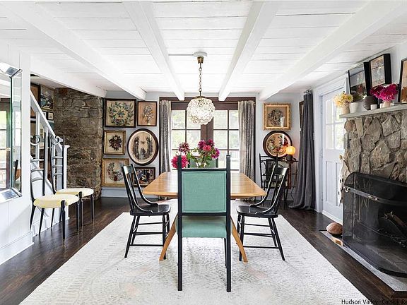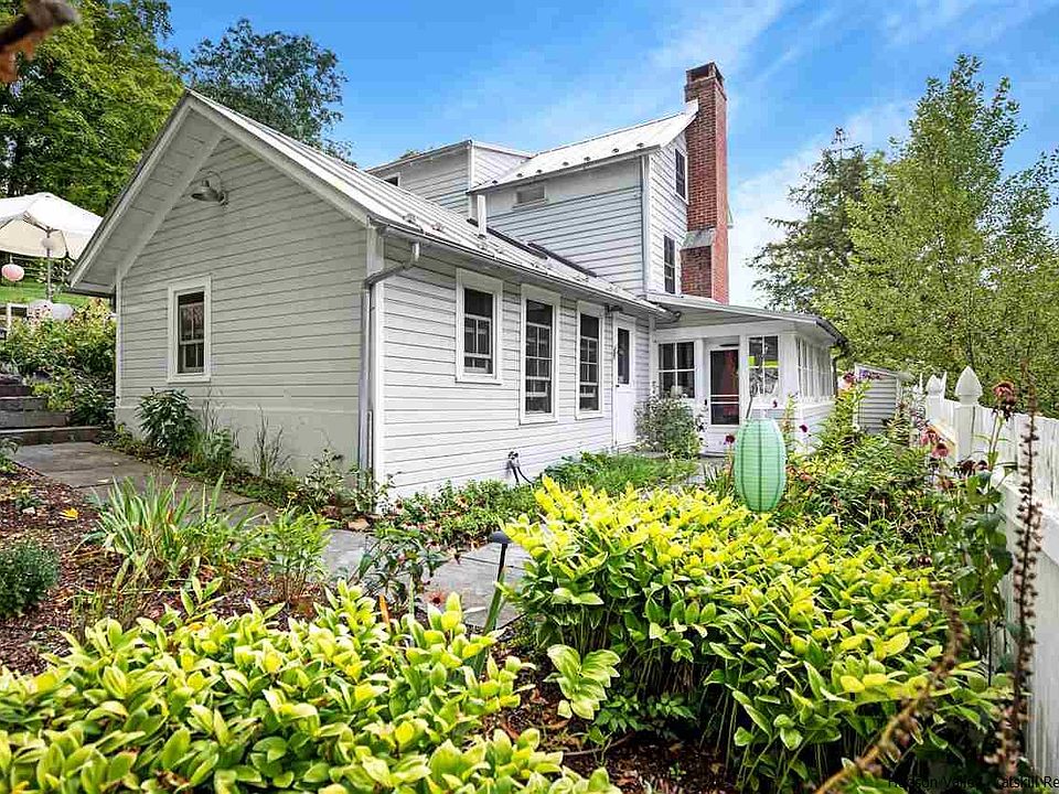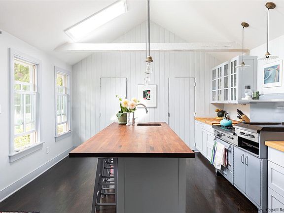 Built in 1890 and renovated in 2014, this elegant and stylish farmhouse is nestled against a hillside on a former horse farm and includes a 3-story barn as well as a 1,200 sq ft studio building that once housed horse stables. Past the white picket fence and through the enclosed porch, enter into the warm and charming dining room with its stone accents and wood burning fireplace. Windows and skylights bring in tons of light to the spectacular kitchen addition on the ground floor which includes ample space to cook and entertain, a delightful butler's pantry and an adjacent full bath with a gorgeous clawfoot tub. The open second level is divided by stairs into a living room with another working fireplace and separate library/seating area. An airy, enclosed porch leads out to the incredible terraced gardens, rolling hill, and 2 separate bluestone patios which are also accessible via paths along the perimeter of the house. On the third floor, two bright bedrooms and one full bath round out the living space in the main house. Across Kripplebush Rd, the large, heated studio building sits on an open meadow next to a lovely pond and is the perfect workspace away from the main house with potential to be used for guests as well. The 3-story barn adds even more possibilities for work, storage, or events. Located in the popular and desirable hamlet of Stone Ridge, the property has convenient access to dining and shopping in Stone Ridge and High Falls as well as so many breweries, orchards, and farm markets in the area and is only 1.5 hours from NYC.