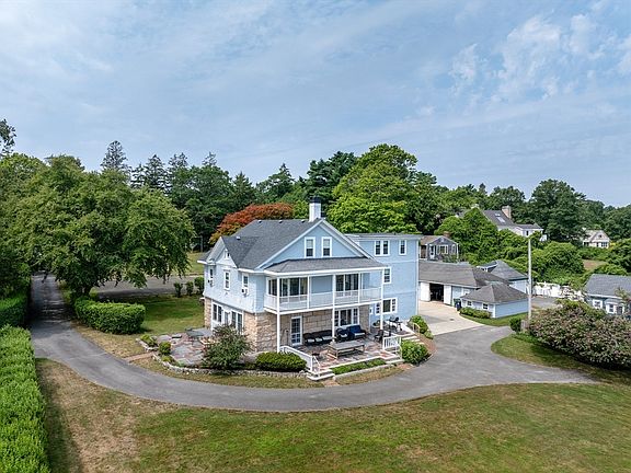 For sale for the first time in over 60-years, this (seasonal) Marion waterfront home borders the western shore of the Weweantic River on the Great Neck peninsula with direct water access and its own stone pier. Once known as the historic Thomas R. Miles House as well as the Weweantic Inn, this c. 1912 property offers privacy, a large yard, a detached multi-bay garage and all the benefits of waterfront living. The house is deeply set back from the road near the east-west center of the parcel and faces south with its west elevation facing the street and its east elevation spanned by a two-story porch overlooking the mouth of the river. The property has a manicured lawn dotted with shrubs and mature trees at the perimeter. A paved tennis court occupies the lawn west of the house. 272 Delano Road has stylistic features of both the Shingle and Colonial Revival styles. Seasonal home in need of updating.