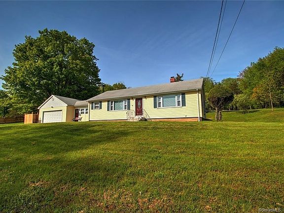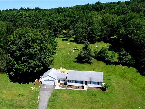 This spacious, remodeled Ranch sits on a picturesque 3.5 acre lot. The open floor plan features a modernized kitchen with granite counter tops and a sizable center island. A huge living room, two large bedrooms, one with an attached bath containing a Jacuzzi tub, all provide ample living space. A wonderful flow is created by the beautiful hardwood floors throughout the entire house. Additionally, the sun room, with a cathedral ceiling, establishes a warm welcome while providing even more finished area. A lively babbling brook flows into a pond, creating a peaceful setting in the backyard. Two outbuildings can be used for garden equipment storage, tools and animals! Call today to for a private showing.