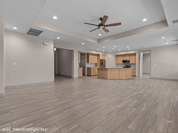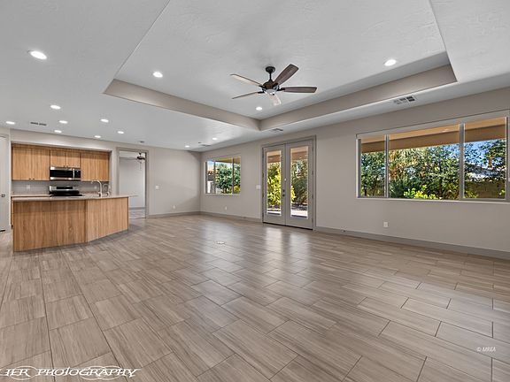 Custom Home with a 5+ Car Garage and RV Parking. This gorgeous CUSTOM home is located in Leavitt Estates, a highly sought after community south of I-15 offering wide open spaces, attractive architecture and NO Home Owner's Association. This home has a timeless design, exceptional craftsmanship and construction quality (2 X 6), exquisite finishes and a modern flair. Situated on a private, quarter acre lot, this home is a rare find in a non-HOA community. The backyard faces east and the yard has privacy walls, a lengthy covered patio for outdoor enjoyment and paver surfaces. The impressive 5+ car garage spans an incredible 1,410 square feet. Car enthusiasts and hobbyists will appreciate the third bay that extends 47 feet deep, providing ample room for vehicles, recreation vehicles, workshop and/or storage needs. In addition, the home has RV parking with a convenient metal gate for access and security. The interior is beautifully appointed and the open concept floor plan flows seemlessly throughout. Each of the 3 spacious bedrooms features its own private, luxurious bathroom. A convenient drop zone provides the perfect spot for shoes and daily essentials and the laundry room is lined with cabinets. The carpet is brand new.